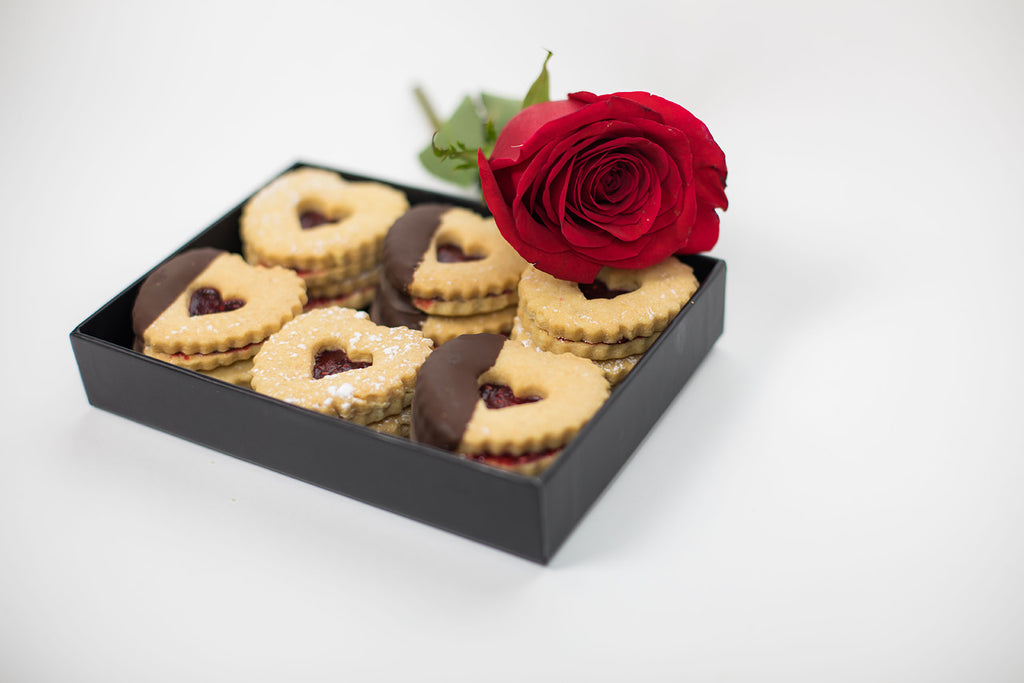 Includes 8 Linzer cookies filled with raspberry jam and 4 covered in chocolate.